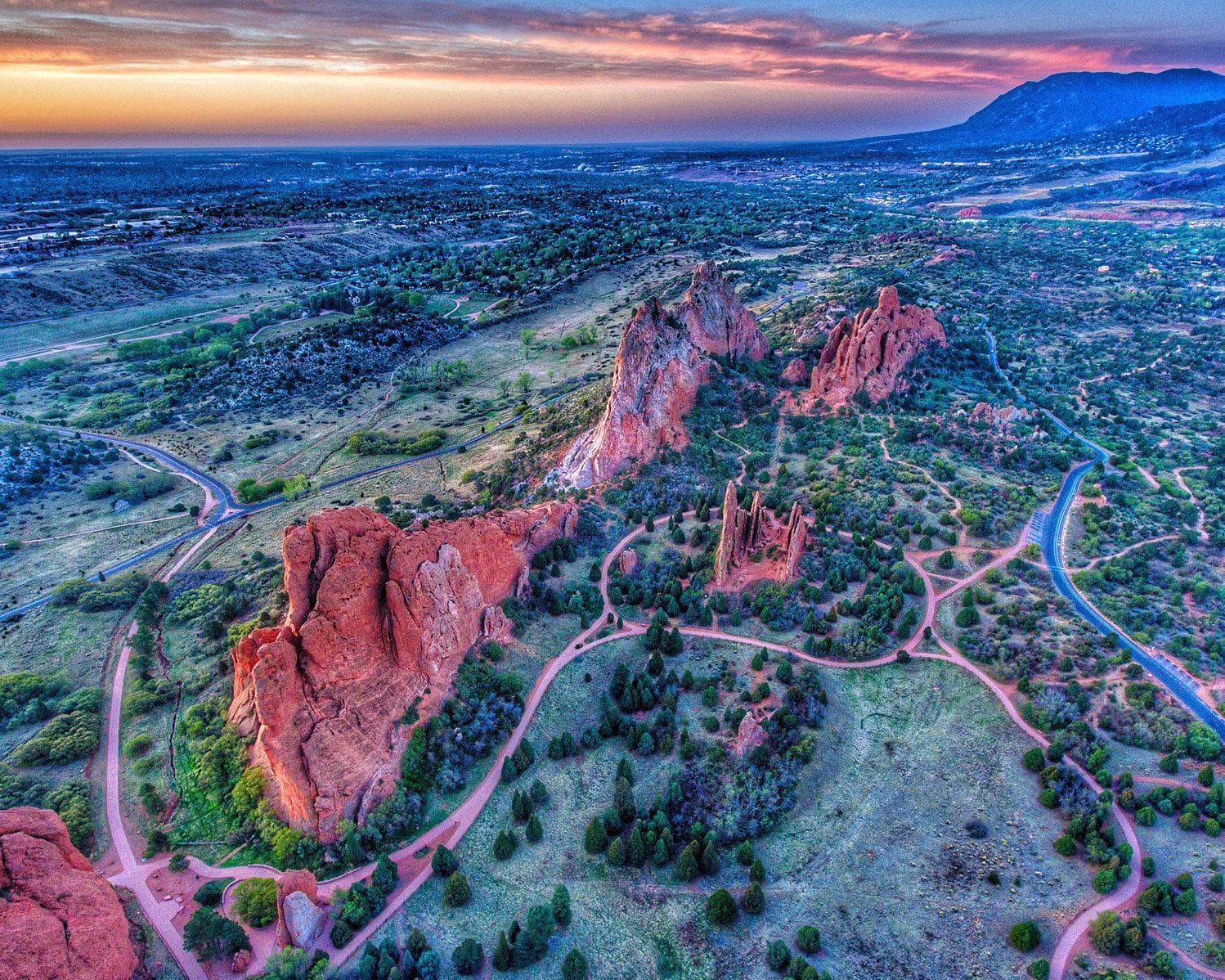 Colorado Springs is the second largest city in Colorado, behind Denver to the north, and defines the northeastern tip of the south central region of the state. Attractive mountain scenery is nearby. Colorado Springs is the state's second-largest city, but it's first in the hearts of many visitors as a place of spectacular beauty with dozens of family attractions, natural landmarks and unique museums. One of the nation's most fabulous city parks, Garden of the Gods, is nestled in the foothills of Pikes Peak. The stunning red rock formations draw tourists with cameras in tow to capture a perfect shot of the rocks framing the snow-capped peak. The city sits at the foot of one of America's most famous landmarks, Pikes Peak, upon whose summit Katharine Lee Bates was inspired to write "America the Beautiful.